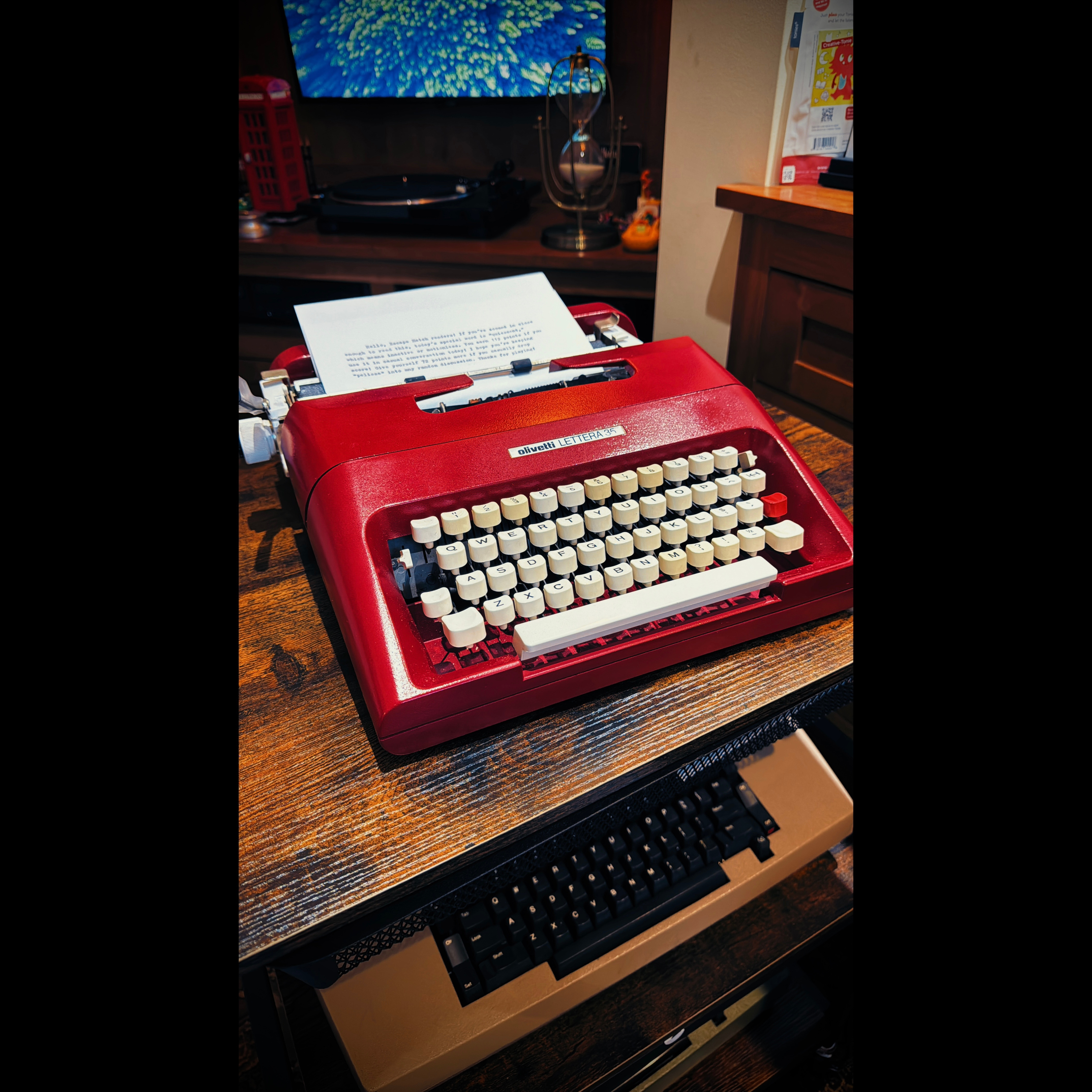 I’ve got a whole stack of functioning typewriters, and I thought I’d rotate them between pieces, see how it goes. I’ve got a frail Selectric III (with a fancy-pants innovation: Correct-Tape!), a robust olive-colored Selectric II, and the one I’m using currently, my blood-red Olivetti, a 60-year-old manual. So far it seems like there might still be some good words left in this antique. Whether I refer here to the machine or the man sitting behind it, I leave you to decide.
